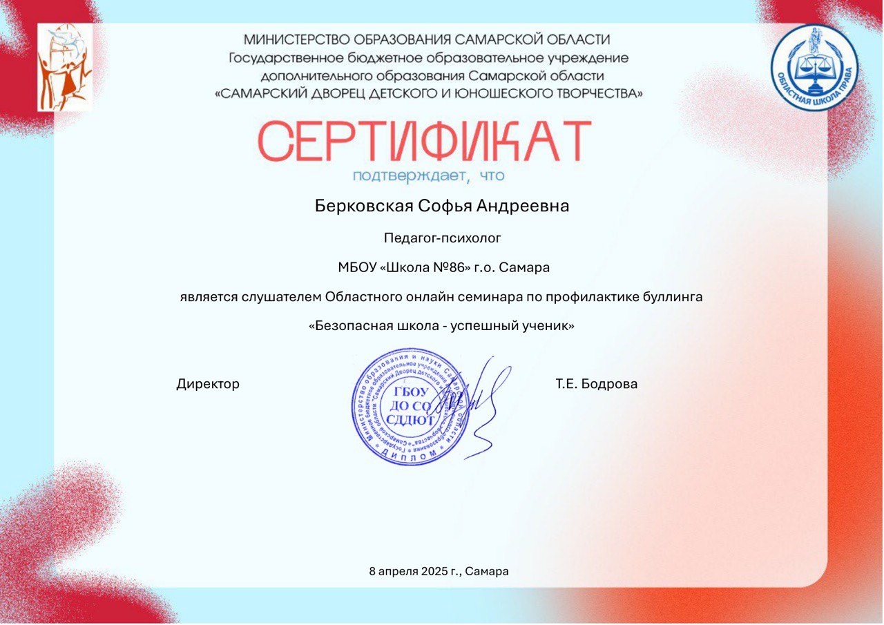 В рамках «Недели психологии» в МБОУ Школе № 86 г.о. Самара волонтеры и медиаторы школьной службы примирения провели в 6 Д классе круг сообщества посвященный успехам и мечтам, с использованием упражнений немецкого психолога Карла Фопеля из книги «Как научить детей сотрудничать?». В ходе данного мероприятия обучающиеся рассказали о своих последних успехах и нарисовали свои мечты, которые они хотят достичь в будущем.
